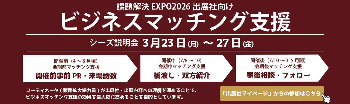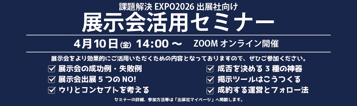 出展募集に伴い、「どんな展示会?」「費用は?」「準備はいつから?」といった疑問にお答えする説明会(ZOOMで約1時間)を以下日時で開催します。